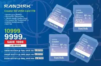 This special is available in various stores, view all products to get the cheapest SanDisk Creator SD UHSII Card 1TB. If you'd like to find out whether this product has a bigger discount in another store, check the category 'Electronics'. You may also find these specials interesting: Sandisk Micro SD Card 64GB Class 10, Sandisk Ultra Micro SD 16GB Card & Sandisk Ultra Micro SD 64GB Card.