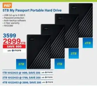 Incredible Connection offers a wide collection of products, besides the WD 5TB My Passport Portable Hard Drive. Keep an eye on the weekly Incredible Connection catalogue to find the best specials and promotions. Besides WD 5TB My Passport Portable Hard Drive, you can also find the following offers: My Passport 5TB Portable Hard Drive, Toshiba 2.5" 1TB USB 3.0 Hard Drive Canvio & SanDisk Cruzer Blade 16GB USB Hard Drive.