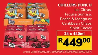 Chillers Punch Ice Citrus, Tequila Sunrise, Peach & Mango or Caribbean Chaos Spirit Cooler promotion at Jumbo