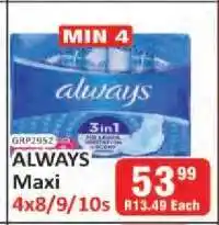 This special is available in various stores, view all products to get the cheapest ALWAYS Maxi. If you'd like to find out whether this product has a bigger discount in another store, check the category 'Wholesale'. You may also find these specials interesting: Always Maxi, Maxi Slim or Ultra Pads, Always Maxi Pads Assorted & Always Maxi, Maxi Slim or Ultra Pads.