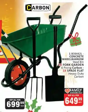1X CONCRETE WHEELBARROW Steel Bin + 1X FORK GARDEN 4 Prong Carbon + 1X SPADE FLAT Heavy Duty Carbon