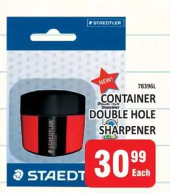 This special is available in various stores, view all products to get the cheapest Container Double Hole Sharpener. If you'd like to find out whether this product has a bigger discount in another store, check the category 'Wholesale'. You may also find these specials interesting: Sharpener 2 Hole With Container, Staedtler Double Hole Container-1s & Marlin 2 Hole Plastic Sharpener Container.