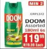 This special is available in various stores, view all products to get the cheapest Doom Assorted. If you'd like to find out whether this product has a bigger discount in another store, check the category 'Wholesale'. You may also find these specials interesting: Doom Insecticide Assorted, Doom Insecticide 300 ml Assorted & DOOM INSECT Killer Assorted 300ml.