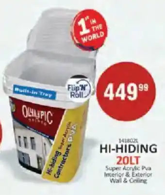This special is available in various stores, view all products to get the cheapest Olympic hi-hiding. If you'd like to find out whether this product has a bigger discount in another store, check the category 'Wholesale'. You may also find these specials interesting: Olympic Paints Decor Acrylic PVA 20lt, Olympic water based plaster primer & Hi Heat Spray.