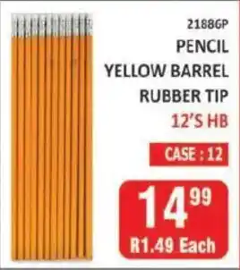 This special is available in various stores, view all products to get the cheapest Pencil yellow barrel rubber tip. If you'd like to find out whether this product has a bigger discount in another store, check the category 'Wholesale'. You may also find these specials interesting: Yellow Barrel Rubber Tipped Pencils, Yellow Barrel HB Rubber Tipped Pencils & UBL Yellow Rubber Gloves.