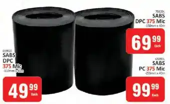 This special is available in various stores, view all products to get the cheapest SABS DPC 375 Mic. If you'd like to find out whether this product has a bigger discount in another store, check the category 'Wholesale'. You may also find these specials interesting: SABS USB Green Plastic 250 Mic, SABS Conduit & Carbon Dpc Plastic.