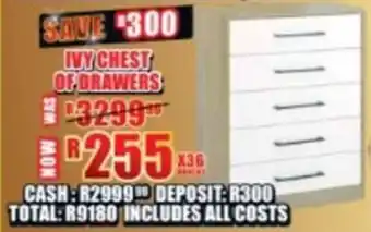 This special is available in various stores, view all products to get the cheapest Ivy chest of drawers. If you'd like to find out whether this product has a bigger discount in another store, check the category 'Home furniture'. You may also find these specials interesting: Rodus Chest of Drawers, Home & Kitchen Chest Of Drawers (735964) & Home & Kitchen Chest of Drawers.