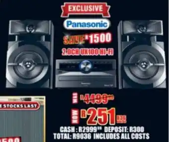 This special is available in various stores, view all products to get the cheapest Panasonic 2.0Ch UX-100 HIi-Fi. If you'd like to find out whether this product has a bigger discount in another store, check the category 'Home furniture'. You may also find these specials interesting: Panasonic AKX520 Hi-Fi, ASUS 14" Zenbook UX3407 Laptop & 4G LTE Mobile Wi-Fi.