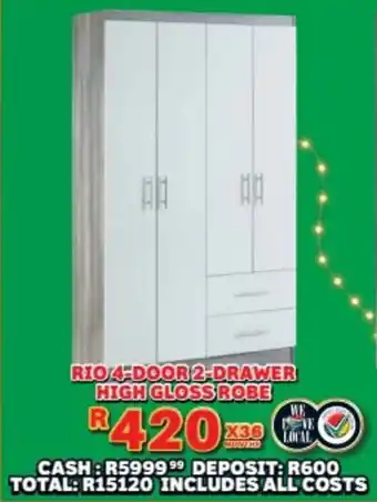 This Rio 4-door 2-drawer high gloss robe is available in the following branches based on your set location: