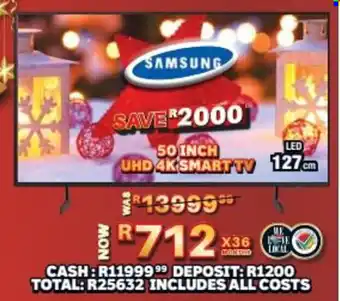 This special is available in various stores, view all products to get the cheapest Samsung 50 inch UHD 4K Smart TV. If you'd like to find out whether this product has a bigger discount in another store, check the category 'Home furniture'. You may also find these specials interesting: Samsung 65 inch UHD 4K Smart TV, Samsung 55 inch UHD 4K Smart TV & Hisense 58-inch Smart 4K UHD TV- 58A6N.