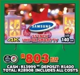 This special is available in various stores, view all products to get the cheapest Samsung 55 inch UHD 4K Smart TV. If you'd like to find out whether this product has a bigger discount in another store, check the category 'Home furniture'. You may also find these specials interesting: Samsung 50 inch UHD 4K Smart TV, Samsung 65 inch UHD 4K Smart TV & Hisense 58-inch Smart 4K UHD TV- 58A6N.