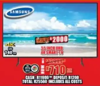 This special is available in various stores, view all products to get the cheapest Samsung 55 inch und 4k smart tv. If you'd like to find out whether this product has a bigger discount in another store, check the category 'Home furniture'. You may also find these specials interesting: Samsung 43-inch FHD Smart TV, Samsung 50 inch uhd 4k smart tv & 32-inch Smart HD TV-32A40.