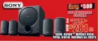 This special is available in various stores, view all products to get the cheapest Sony home theatre system. If you'd like to find out whether this product has a bigger discount in another store, check the category 'Home furniture'. You may also find these specials interesting: Sony sa-d40m2 4.1ch home theatre system, Sony 6 Speaker Theatre Sound System HT-S60 & Hisense 800W Home Theatre 23-798.