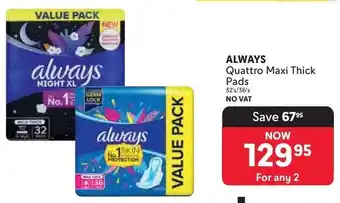 The Always Quattro Maxi Thick Pads is available this week at Makro as part of a special promotion. On this page, you’ll find everything about the promotional price, terms, and current specials. Browse related promotions and offers for Always Quattro Maxi Thick Pads to make sure you don’t miss out.