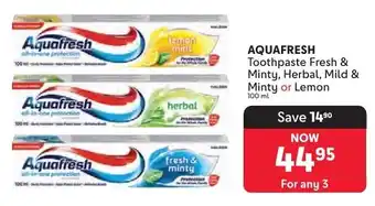 AQUAFRESH Toothpaste Fresh & Minty, Herbal, Mild & Minty or Lemon Discount at Makro