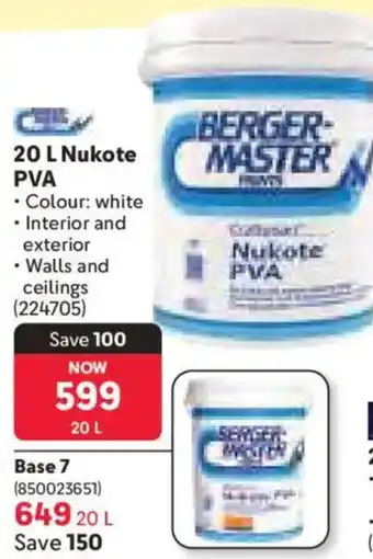 This special is available in various stores, view all products to get the cheapest Bergermaster Nukote PVA. If you'd like to find out whether this product has a bigger discount in another store, check the category 'Wholesale'. You may also find these specials interesting: Berger Master 20L Nukote PVA (98879), Berger Master 20L Nukote PVA White 81465386 & Bergermaster.