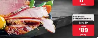 The Bulk 3-Pack Boneless Gammon is now available with a discount at Makro. On this page, you’ll find everything about the current price, promotion conditions, and how long the offer is valid. Also explore other offers and promotions for Bulk 3-Pack Boneless Gammon to make a smart and cost-effective choice.