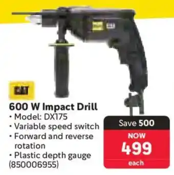 This special is available in various stores, view all products to get the cheapest CAT 600 W Impact Drill. If you'd like to find out whether this product has a bigger discount in another store, check the category 'Wholesale'. You may also find these specials interesting: RYOBI 550 W Impact Drill, Ryobi 550 W Impact Drill & Ryobi 850 W Impact Drill.