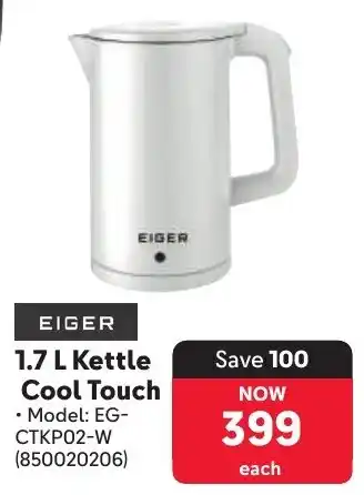 Makro offers a wide collection of products, besides the Eiger Kettle Cool Touch. Keep an eye on the weekly Makro catalogue to find the best specials and promotions. Besides Eiger Kettle Cool Touch, you can also find the following offers: Eiger Stainless Steel Kettle, EIGER Eras Glass Kettle & Swan Medium Cool Touch Breakfast Pack.