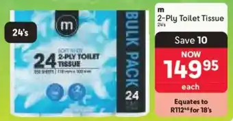 This special is available in various stores, view all products to get the cheapest m 2-Ply Toilet Tissue. If you'd like to find out whether this product has a bigger discount in another store, check the category 'Wholesale'. You may also find these specials interesting: Twinsaver 1 Ply Toilet Tissue, Twinsaver 1 Ply Toilet Tissue-15 Pack & PnP no name 1 Ply Toilet Tissue 10s.