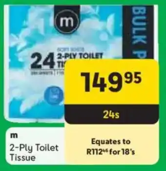 This special is available in various stores, view all products to get the cheapest m 2-Ply Toilet Tissue. If you'd like to find out whether this product has a bigger discount in another store, check the category 'Wholesale'. You may also find these specials interesting: Twinsaver 1 Ply Toilet Tissue, Twinsaver 1 Ply Toilet Tissue-15s & Twinsaver 1 Ply Toilet Tissue-15 Pack.