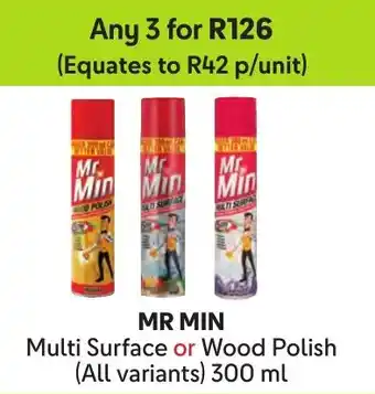 This special is available in various stores, view all products to get the cheapest MR MIN Multi Surface or Wood Polish. If you'd like to find out whether this product has a bigger discount in another store, check the category 'Wholesale'. You may also find these specials interesting: MR MIN Multi Surface or Wood Polish, Mr. Min Wood or Multi Surface Polish Asstd. & Mr Min Multi Surface or Wood Cleaner Assorted 300ml Each.