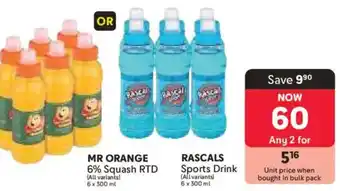 MR ORANGE 6% Squash RTD or RASCALS Sports Drink promotion at Makro