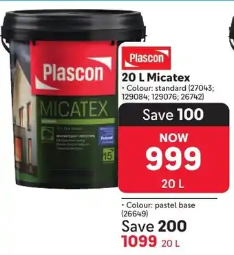 This special is available in various stores, view all products to get the cheapest Plascon Micatex. If you'd like to find out whether this product has a bigger discount in another store, check the category 'Wholesale'. You may also find these specials interesting: Plascon Micatex, Plascon Micatex & Plascon Micatex 705421-20Ltr.