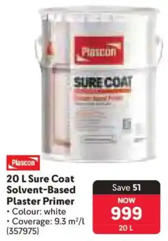 Makro offers a wide collection of products, besides the Plascon Sure Coat Solvent-Based Plaster Primer. Keep an eye on the weekly Makro catalogue to find the best specials and promotions. Besides Plascon Sure Coat Solvent-Based Plaster Primer, you can also find the following offers: Plascon 20L Sure Coat Solvent Based Primer (625239), Plascon Sure Coat Plaster Primer & Plascon Sure Coat Plaster Primer.