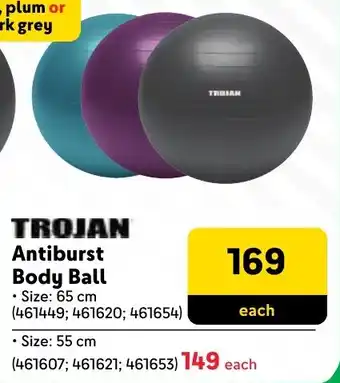 This special is available in various stores, view all products to get the cheapest Trojan Antiburst Body Ball. If you'd like to find out whether this product has a bigger discount in another store, check the category 'Wholesale'. You may also find these specials interesting: Trojan Antiburst Body Ball, Trojan Body Alignment Yoga Mat & 230mm Artificial Ball 719485.