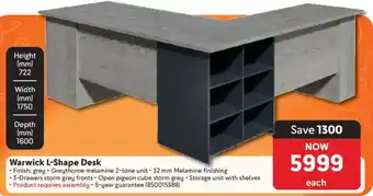 The Warwick L-Shape Desk is available this week at Makro as part of a special promotion. On this page, you’ll find everything about the promotional price, terms, and current specials. Browse related promotions and offers for Warwick L-Shape Desk to make sure you don’t miss out.