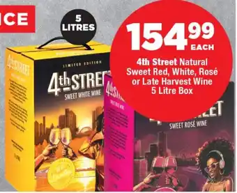 This special is available in various stores, view all products to get the cheapest 4th Street Natural Sweet Red, White, Rosé or Late Harvest Wine Box. If you'd like to find out whether this product has a bigger discount in another store, check the category 'Grocery stores'. You may also find these specials interesting: 4th Street Natural Sweet Red, Natural Sweet Rosé, Natural Sweet White or Late Harvest Box Wine, 4th Street Natural Sweet White, Red, Rosé or Late Harvest Wine & JUST WINE NATURAL SWEET WHITE/RED/ROSÉ WINE 5ℓ.