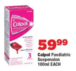 This special is available in various stores, view all products to get the cheapest Calpol Paediatric Suspension. If you'd like to find out whether this product has a bigger discount in another store, check the category 'Grocery stores'. You may also find these specials interesting: Calpol Strawberry Flavoured Paediatric Suspension, Calpol Strawberry Flavoured Paediatric Suspension & Calpol Paediatric Syrup.