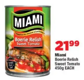 OK Foods offers a wide collection of products, besides the Miami Boerie Relish Sweet Tomato. Keep an eye on the weekly OK Foods catalogue to find the best specials and promotions. Besides Miami Boerie Relish Sweet Tomato, you can also find the following offers: Miami Braai Relish, MIAMI Braai Relish & Miami Relish Assorted-450gm Each.
