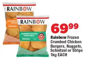 Rainbow Frozen Crumbed Chicken Burgers, Nuggets, Schnitzel or Strips promotion at OK Foods