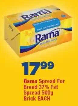 This special is available in various stores, view all products to get the cheapest Rama Spread For Bread 37% Fat Spread Brick. If you'd like to find out whether this product has a bigger discount in another store, check the category 'Grocery stores'. You may also find these specials interesting: RAMA SPREAD FOR BREAD 40% FAT SPREAD 500g, Rama Spread for Bread 37% Fat Spread 1kg & Rama 37% Fat Spread for Bread.