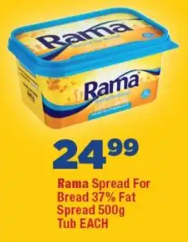 This special is available in various stores, view all products to get the cheapest Rama Spread For Bread 37% Fat Spread Tub. If you'd like to find out whether this product has a bigger discount in another store, check the category 'Grocery stores'. You may also find these specials interesting: Rama Spread for Bread 37% Fat Spread Tub, Rama 37% Fat Spread for Bread & Rama 37% Fat Spread for Bread 1kg.