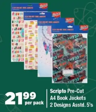 This special is available in various stores, view all products to get the cheapest Scripto Pre-Cut A4 Book Jackets. If you'd like to find out whether this product has a bigger discount in another store, check the category 'Grocery stores'. You may also find these specials interesting: Scripto A4 Pre-Cut Book Covers (798033)-Each, Assorted Pre Cut A4 Book Covers & Pre Cut A4 Book Covers Assorted.