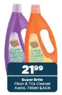 This special is available in various stores, view all products to get the cheapest Super Brite Floor & Tile Cleaner Asstd.. If you'd like to find out whether this product has a bigger discount in another store, check the category 'Grocery stores'. You may also find these specials interesting: Super Brite Multi-Surface Cleaner Asstd., Super Brite Pine Gel Asstd. & Mr Muscle Tile Cleaner Asstd..
