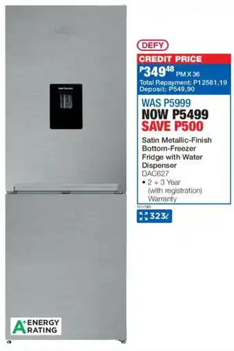 This special is available in various stores, view all products to get the cheapest Defy Satin Metallic-Finish Bottom-Freezer Fridge with Water Dispenser. If you'd like to find out whether this product has a bigger discount in another store, check the category 'Home furniture'. You may also find these specials interesting: DEFY Satin Metallic-Finish Bottom-Freezer Fridge with Water Dispenser DAC627, DEFY Satin Metallic-Finish Bottom-Freezer Fridge & Defy Satin Metallic-Finish Bottom-Freezer Fridge.