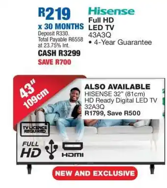 This special is available in various stores, view all products to get the cheapest Hisense Full HD LED TV 43A3Q. If you'd like to find out whether this product has a bigger discount in another store, check the category 'Home furniture'. You may also find these specials interesting: Hisense Full HD LED TV 43A3Q, Hisense 43" Full HD LED TV & Hisense 32 Full HD 60HZ TV.