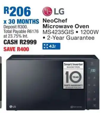 This special is available in various stores, view all products to get the cheapest LG NeoChef Microwave Oven MS4235GIS. If you'd like to find out whether this product has a bigger discount in another store, check the category 'Home furniture'. You may also find these specials interesting: LG 42L Neochef Solo Microwave MS4235GIS (770563), LG 42 L NeoChef Solo Microwave & Hisense 28Ltr Microwave Oven 24-026.