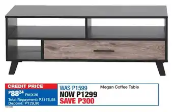 This special is available in various stores, view all products to get the cheapest Megan Coffee Table. If you'd like to find out whether this product has a bigger discount in another store, check the category 'Home furniture'. You may also find these specials interesting: Coffee Table, Cassa Coffee Table & Samoa coffee table.