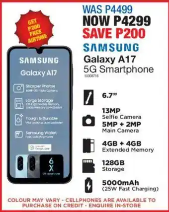 This special is available in various stores, view all products to get the cheapest Samsung Galaxy A17 5G Smartphone. If you'd like to find out whether this product has a bigger discount in another store, check the category 'Home furniture'. You may also find these specials interesting: Samsung Galaxy A26 Smartphone, SAMSUNG Galaxy A06 Smartphone & SAMSUNG Galaxy A07 Smartphone.