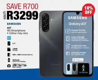 This special is available in various stores, view all products to get the cheapest Samsung Galaxy A17. If you'd like to find out whether this product has a bigger discount in another store, check the category 'Home furniture'. You may also find these specials interesting: Samsung Galaxy A07, Samsung Galaxy A36 5G & Samsung Galaxy A36 128GB.