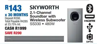 SKYWORTH 2.1 Channel Soundbar with Wireless Subwoofer offers and online specials, directly from OK Furniture