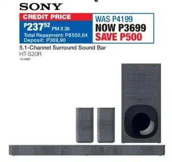 This special is available in various stores, view all products to get the cheapest Sony 5.1-Channel Surround Sound Bar. If you'd like to find out whether this product has a bigger discount in another store, check the category 'Home furniture'. You may also find these specials interesting: Sony 5.1 Channel Sound Bar- HT-S20R, Hisense 2.1 channel sound bar & VolkanoX 2.1 Channel Sound Bar Supersonic.