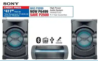 This special is available in various stores, view all products to get the cheapest Sony High Power Audio System. If you'd like to find out whether this product has a bigger discount in another store, check the category 'Home furniture'. You may also find these specials interesting: Sony 6 Speaker Theatre Sound System HT-S60, Motorola G06 Power & AIM 10000mAh Power Bank.