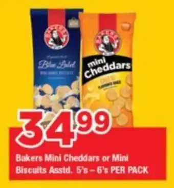 This special is available in various stores, view all products to get the cheapest Bakers Mini Cheddars or Mini Biscuits. If you'd like to find out whether this product has a bigger discount in another store, check the category 'Grocery stores'. You may also find these specials interesting: Bakers Mini Cheddars or Mini Biscuits Asstd., Bakers Mini Cheddars/ Marie/ Tennis/ Eet-Sum-Mor Biscuits & Bakers Mini Cheddars.