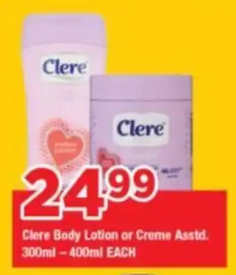 This special is available in various stores, view all products to get the cheapest Clere Body Lotion or Creme. If you'd like to find out whether this product has a bigger discount in another store, check the category 'Grocery stores'. You may also find these specials interesting: Clere Body Cream & Lotion Assorted, Clere Cream OR Lotion & Clere Cream OR Lotion Assorted.